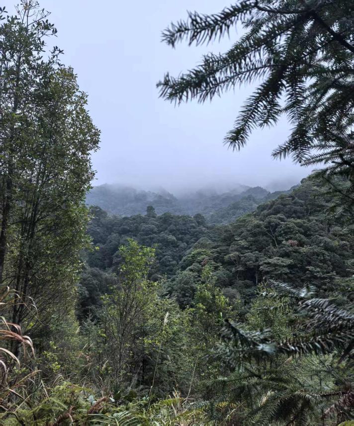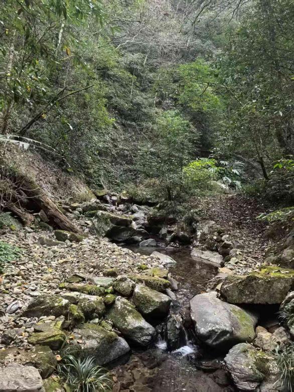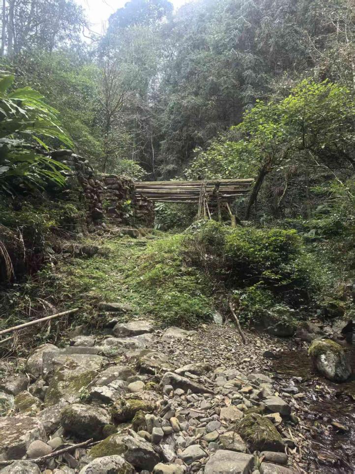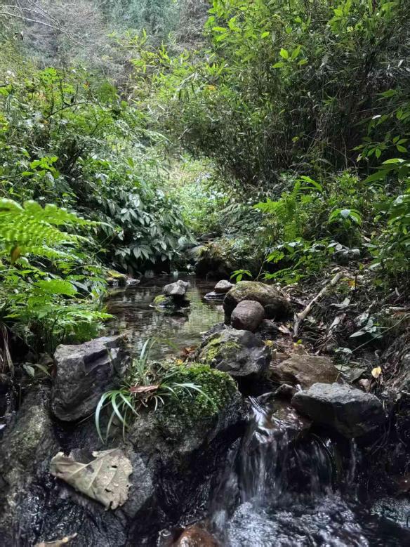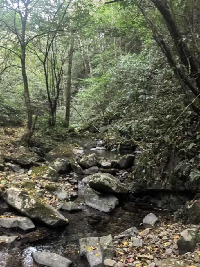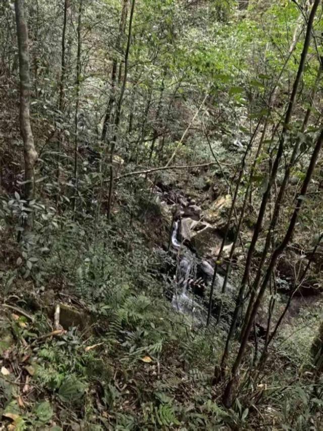 继续往上走,风大了起来,竹子多了,新竹老竹相互搀扶像篱笆,常年没人收割,自然繁衍,一派原始。顺着一条厚实竹叶小径,慢慢来到山的最高处,海拔1493米;小溪忽明忽暗,总是不断。