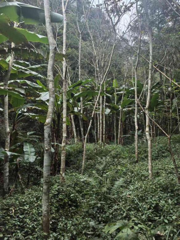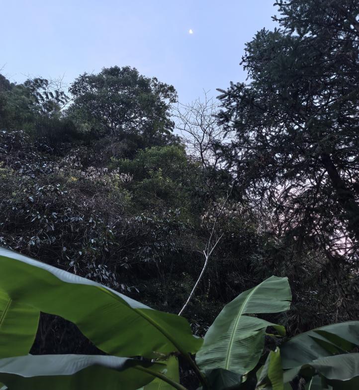 走着走着,小溪没了声响,连进山的路也淹没在芭蕉树丛中,这是一片开阔些的地段,鸟在远处有一搭无一搭唱,阳光在前方一缕缕透过来,前面应该还有高处。