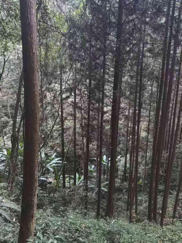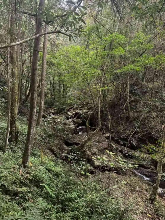 过了山口,从山后盘山向前饶了一会,走出了竹林,顺着坡又走了一箭路,杉树林茂密起来,小溪若隐若现,水声含蓄,风声赫赫,这里该是小溪的源头了吧。