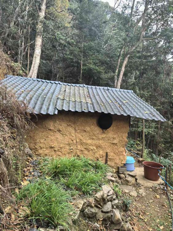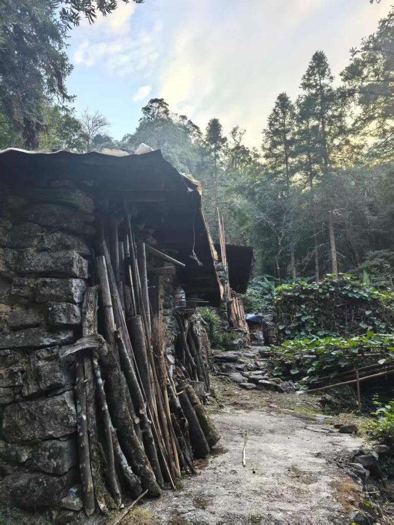 又一家放山的人家,墙是早年垒下的,房顶已备好料,地势相对宽阔,溪边一棵佛手瓜结了一大棚,当地人说,每年采摘完毕,割掉秧,把根保护好,来年又是一大棚,如此这般,能活十几年。
