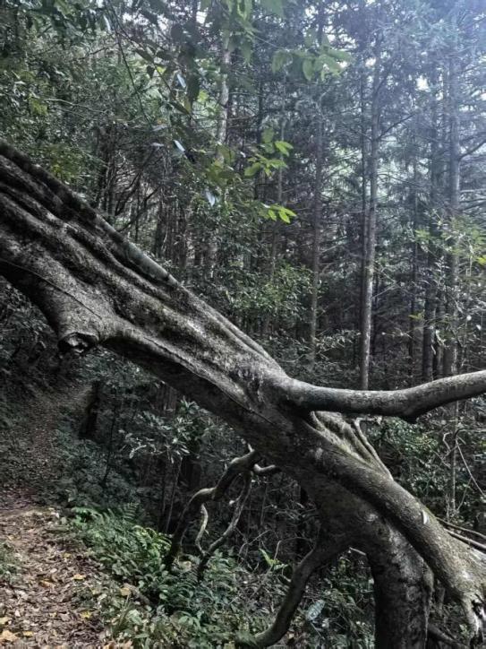 果然,又有一条向上攀援的小路,太不起眼,何况还有一棵未完全倒下的树,树上长满了青苔,很久没有人来过了。望着将要倒下的树,依然生机盎然,尽管根已裸露出来,它的生命力展示出的顽强,令我肃然起敬,真想抱抱它;其实,与一棵树的情感,不是孤单,而是一份缘。