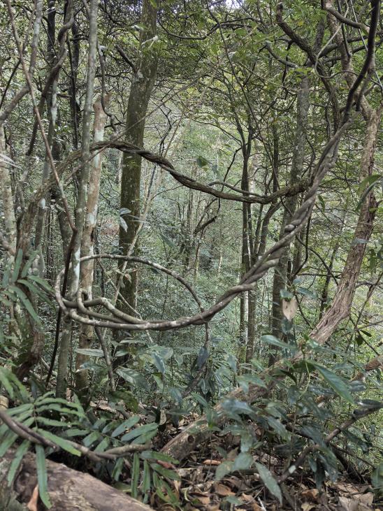 溪边的藤渐渐多了起来,神态各异,虬劲有力,有些老藤大过灌木,它们在水边轻轻一撩,轻而易举地又攀援到高处去了,唯有一株青藤,顺着小溪耐心的向前爬,还不时结一两个果,地瓜般模样,切开肉呈紫红色,后来一问才知道是朱砂莲,难得的中药材,有清热解毒,理气止痛的功效。