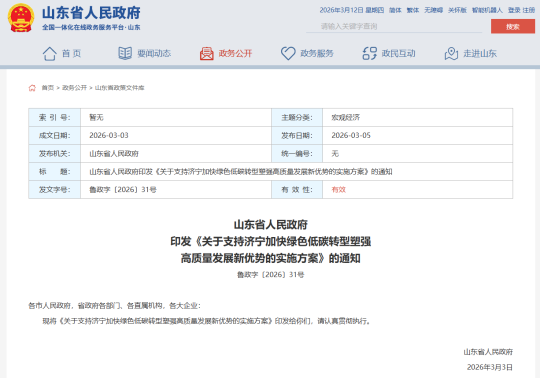 日前,山东省人民政府《关于支持济宁加快绿色低碳转型塑强高质量发展新优势的实施方案》印发。《方案》围绕聚力建设新型工业化强市、加快建设北方内河航运中心、协同推进降碳减污扩绿增长、统筹推进改革开放创新发展、全力打造世界文化旅游名城、着力建设舒适便利宜居城市六项重点任务,明确提出20条具体实施举措。